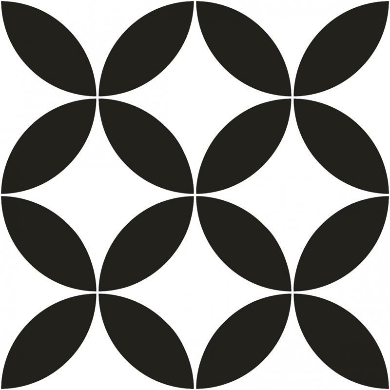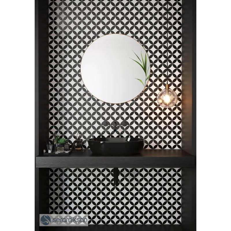 A decorative glazed glossy porcelain wall and floor tile with a white and black retro pattern